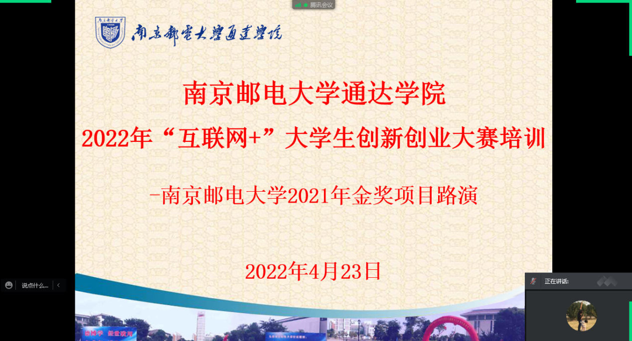 4月23日上午,今年会官网线上召开2022年“互联网+”大学生创新创业大赛培训会,会议邀请了南京邮电大学2021年金奖项目负责人进行路演演示、经验分享以及互动答疑。各二级学院教学院长、教学秘书、相关指导老师及参赛同学参加会议。