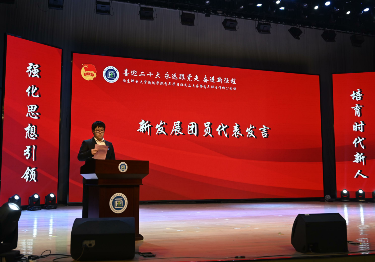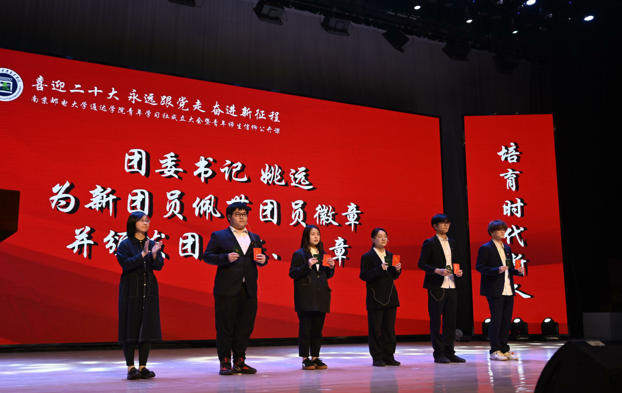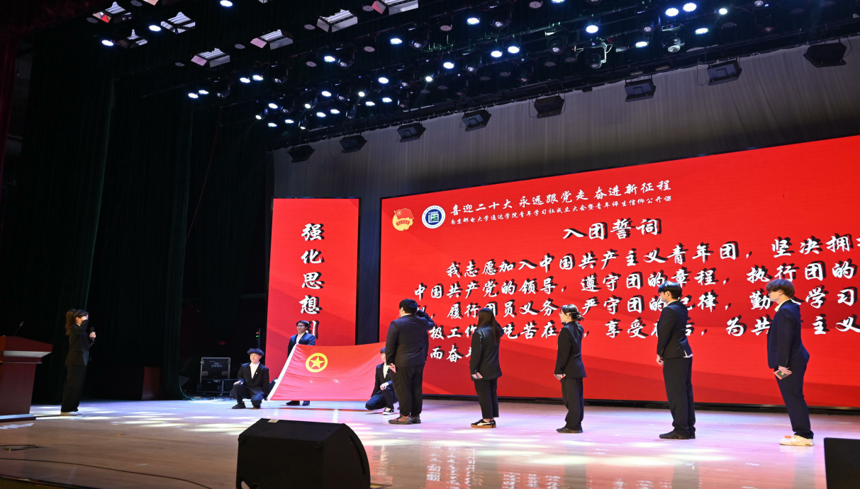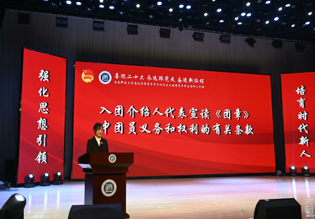 活动在雄壮的国歌声中拉开序幕。新团员入团仪式环节,主持人宣读了新团员名单;团委书记姚远为新团员佩带团员徽章并颁发团员证、团章;团支书代表王雨燕带领新团员面向团旗宣誓;入团介绍人代表李梓涵宣读《团章》中团员义务和权利的有关条款;新发展团员代表杨天辰就如何做好新时代团员向在场同学分享感想与经验;全体同学齐声合唱《光荣啊,中国共青团!》,在慷慨激昂的团歌中,入团仪式落下帷幕。