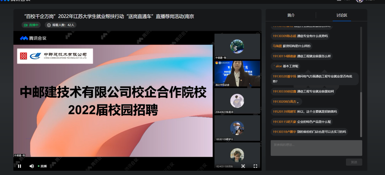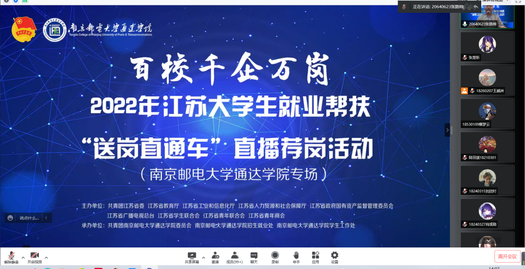 为深入贯彻习近平总书记关于做好“六稳”“六保”工作重要指示精神,紧密围绕稳就业工作大局,推进疫情防控常态化下毕业生的就业服务工作,由团省委、省教育厅、省工信厅、省人社厅、省政国委、省广电总台、省学联、省青联、省青商会主办,今年会官网团委、招就处、学工处承办的“百校千企万岗”2022年江苏大学生就业帮扶行动“送岗直通车”直播荐岗活动(今年会官方网站专场),5月11日在今年会官网就业大厅成功举办。今年会官网800余名应届毕业生通过腾讯会议、腾讯直播线上参与此次活动。