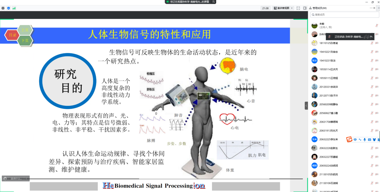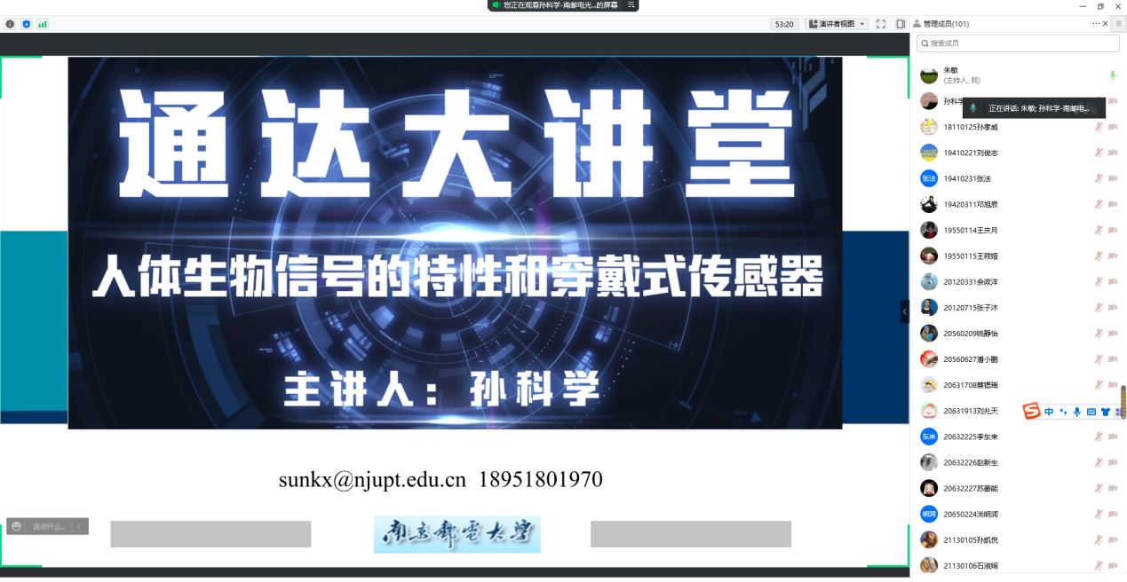 2022年5月21日,应通信工程学院邀请,南京邮电大学孙科学教授为今年会官网师生做了题为《人体生物信号的特性和穿戴式传感器》的学术报告。
