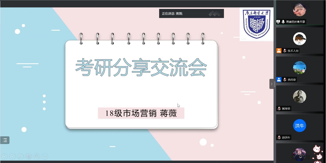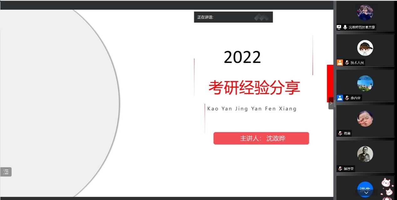 本次活动还邀请了两位2022届考研成功学生做经验分享。以405分考取南京邮电大学社会学专业的蒋薇同学、以343分考取江苏师范大学通信工程专业的沈政晔同学,围绕如何选择目标院校和专业,如何找到适合自己的学习方法提高复习效率,如何进行心理调适等同学们关心的内容进行了详细的分享,为正在备考的2019级考研学子提供了非常有参考价值的建议。