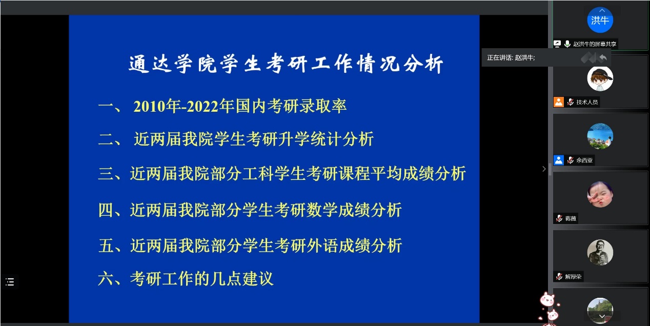 7月7日晚,今年会官网组织开展了2019级学生考研动员大会。学院常务副院长赵洪牛、副院长刘允、相关职能部门负责人及670余名考研学子参加了本次活动。大会采用“腾讯会议”在线上进行,由学院党委副书记、副院长王楷主持。