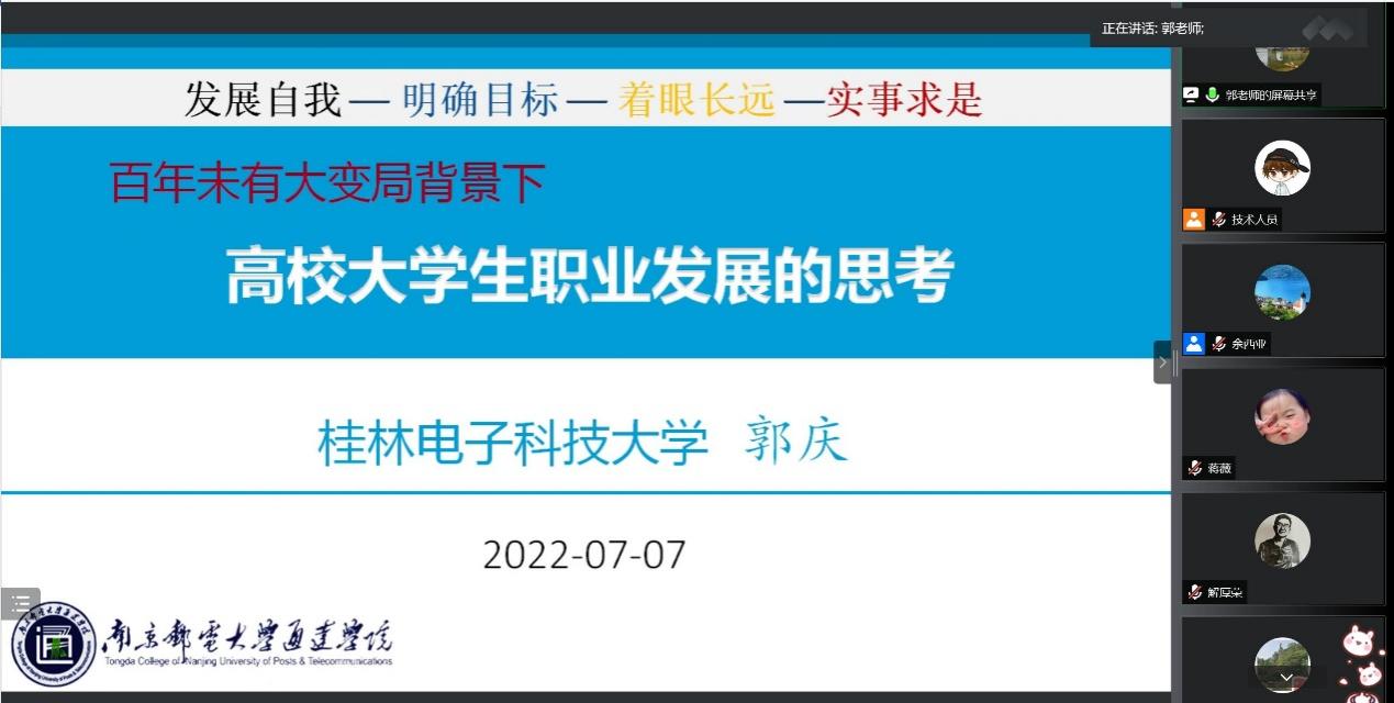全国模范教师、桂林电子科技大学电子工程与自动化学院郭庆教授做“百年未有大变局背景下高校大学生职业发展的思考”主题报告。郭庆教授从为什么、考什么、做什么三个问题出发,理论结合实际,告诉同学们考研是个人发展的最佳路径之一、适合自己就是最好选择以及服务国家才是最优发展的道理。郭教授通过分享典型案例,勉励通达学子,努力就能改变命运,不仅鼓舞了同学们的士气,也增强了大家考研的信心。