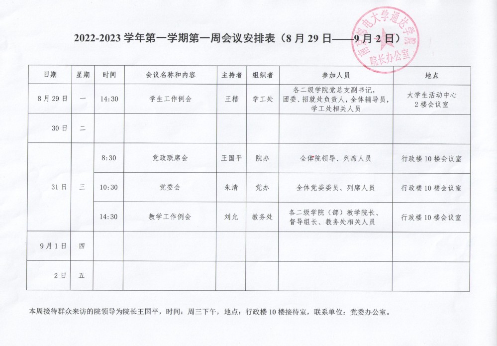 2022-2023学年第一学期第一周会议安排表