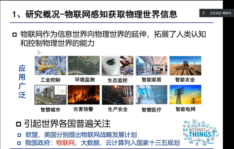 黄海平教授首先介绍了物联网无线感知获取信息的研究概况,以及实现无线感知所需要的理论和技术;然后详细介绍了如何利用物联网无线感知技术设计智能家居,并重点阐述了控制智能家居系统的两个关键步骤:特征提取和分类识别;最后,黄海平教授对物联网感知领域未来的应用拓展进行了展望。