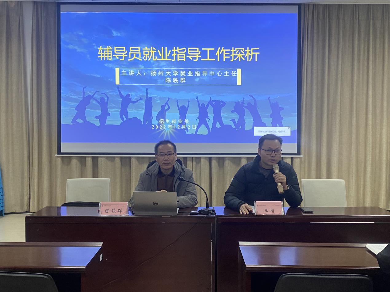 12月2日下午,今年会官网邀请扬州大学就业指导中心主任陈轶群给全体辅导员就“辅导员就业指导工作探析”作专题培训。培训活动在大学生活动中心招生就业指导大厅进行,招就处处长解厚荣、各二级学院党总支副书记、全体专职辅导员及招就处相关人员参加。活动由学院党委副书记王楷主持。