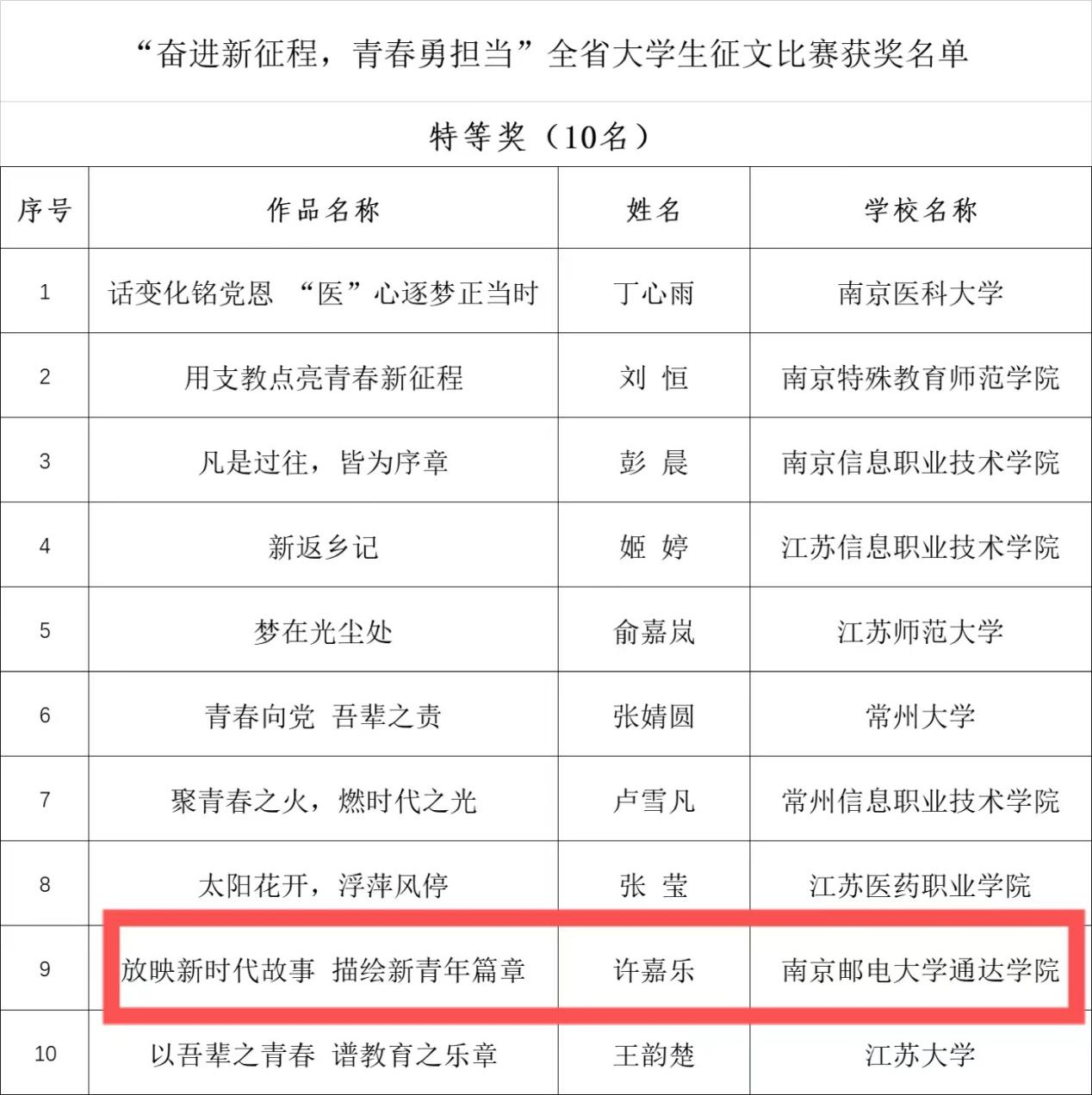 近日,由江苏省委教育工委、江苏省教育厅面向全省高校开展的“奋进新征程,青春勇担当”全省大学生征文比赛结果揭晓。今年会官网电子科学与技术专业许嘉乐同学的作品《放映新时代故事 描绘新青年篇章》荣获特等奖。