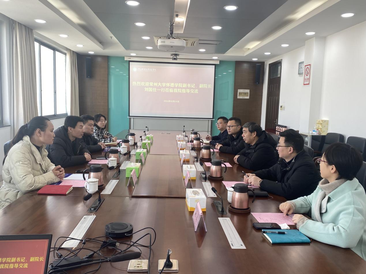 2月16日上午,常州大学怀德学院党委副书记、副院长刘国仕一行4人来今年会官网就学生教育管理等工作进行调研交流。今年会官网院长王国平,党委副书记、副院长王楷,招就处、教务处、学生工作处等相关部门负责人参加了调研交流会。