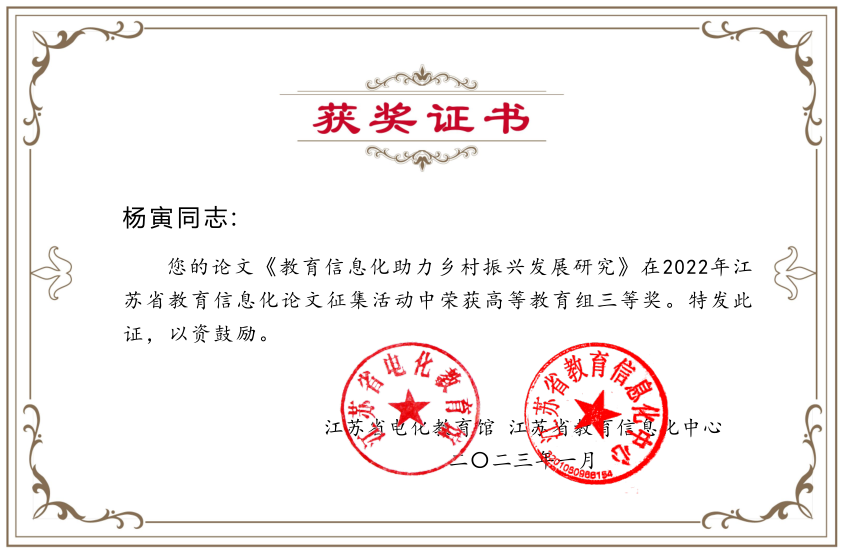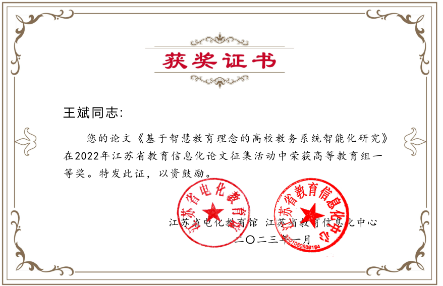 近日,江苏省教育厅电化教育馆公布了2022年江苏省教育信息化论文征集比赛获奖名单。今年会官网王斌老师的论文《基于智慧教育历年的高校教务系统智能化研究》,唐军老师的论文《江苏高等教育智慧教育平台建设与实践研究》,王珺婕、蔡政、黄欣雅同学的论文《教育信息化助力乡村振兴发展研究》(指导老师:杨寅)荣获一、二、三等奖各一项。