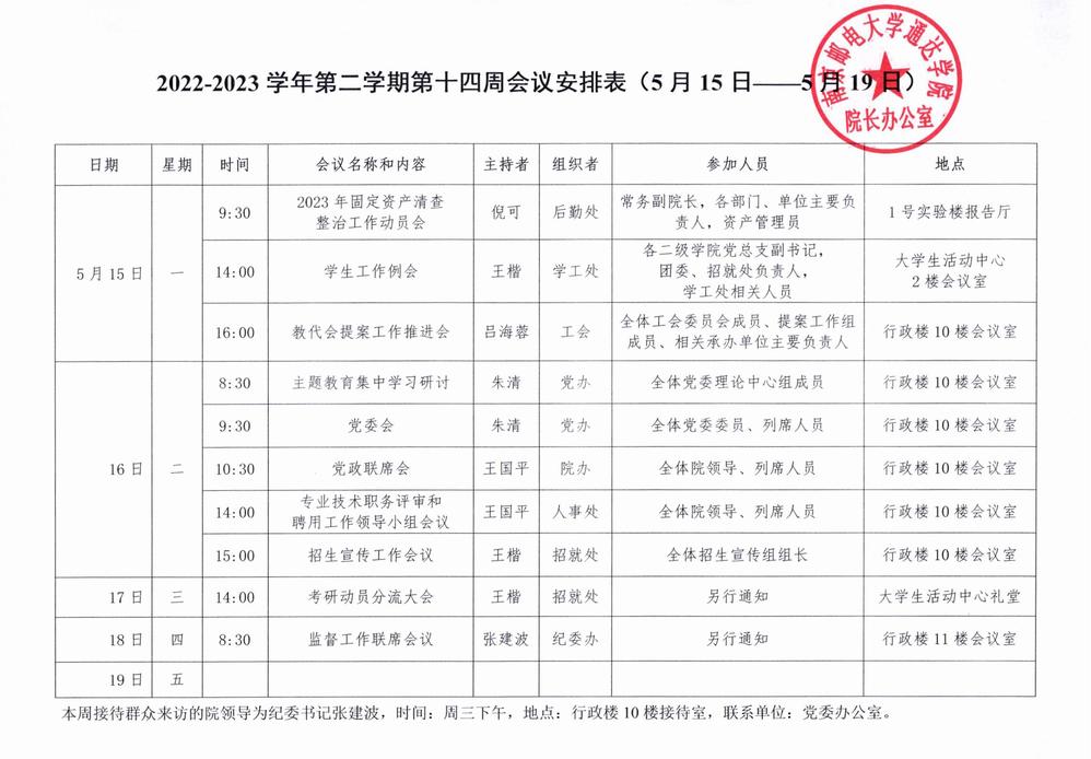 2022-2023学年第二学期第十四周会议安排表
