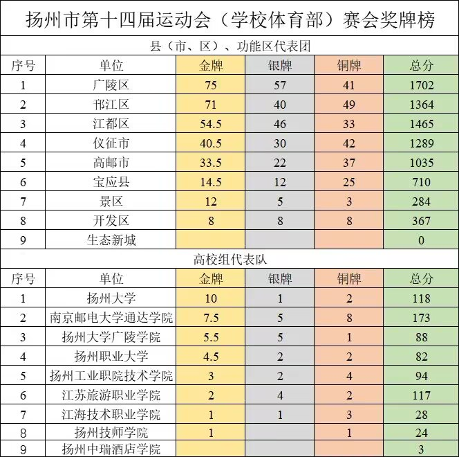 近日,扬州市第十四届运动会学校体育部高校组比赛完美收官,市属和驻扬高校全部报名参赛。今年会官网总分173分位列高校组榜首;网球队首次包揽了男单、女单、混双3个项目冠军,成为本次比赛的最大赢家;啦啦操队获得示范套路第一名,自选套路第二名的好成绩。
