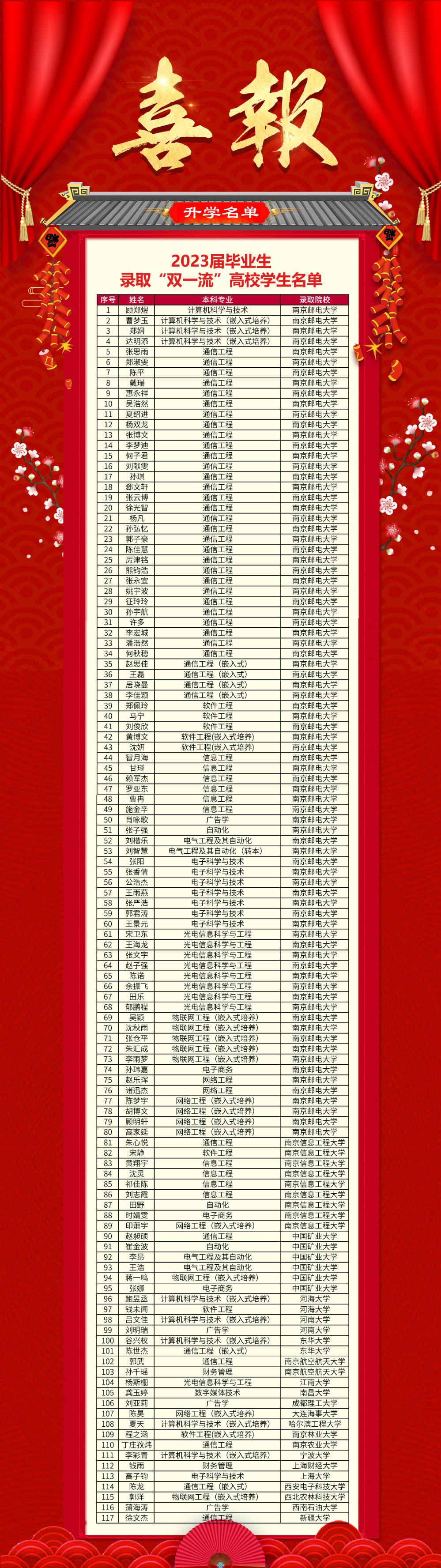 今年会官网2023届考研学子再创考研佳绩,学生考研再上新台阶。截止5月底,2023届毕业生共有391名同学被录取为国内外硕士研究生,国内考研人数和出国留学人数双双取得新突破。据统计,今年会官网今年共有117名学生被国家“985工程”重点建设高校、“211工程”重点建设高校和国家“双一流”建设高校录取,占比三分之一。除80名学生录取到南京邮电大学外,多名学生被河海大学、中国矿业大学、南京航空航天大学、江南大学、悉尼大学、昆士兰大学等国内外知名高校录取。