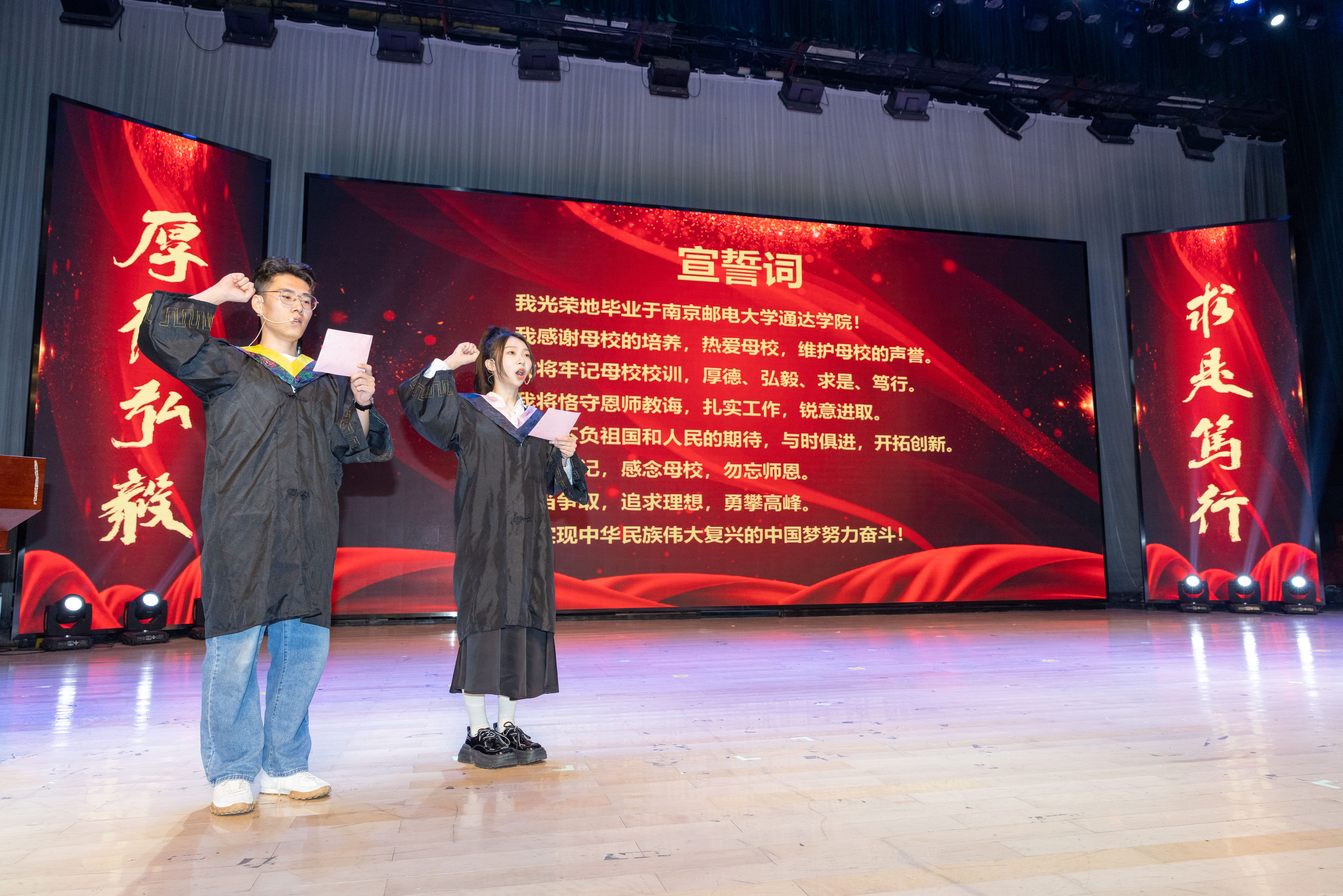 毕业典礼现场,全体毕业生庄严宣誓:“感念母校,勿忘师恩;追求理想,勇攀高峰;为实现中华民族伟大复兴的中国梦努力奋斗!”