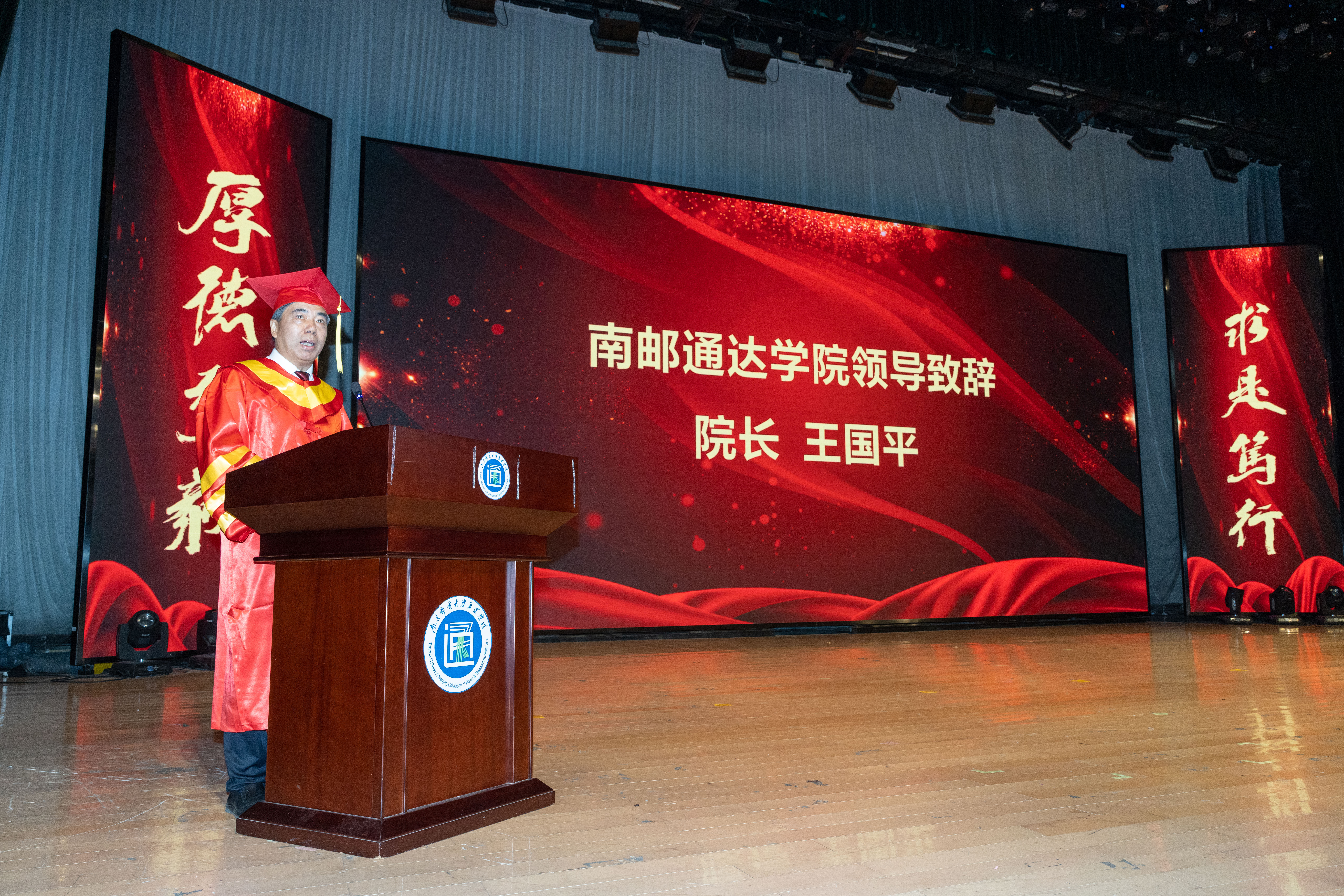 上篇“青春之歌”在器乐《稻香》悠扬的乐声中展开,王国平院长致辞。他代表全院师生员工,向全体毕业生表示热烈的祝贺,向老师和管理服务人员表示衷心的感谢,向倾力倾心培育同学们成长成才的父母表示崇高的敬意!他以“满怀信心向未来 脚踏实地写人生”为题,勉励全体毕业生:一是对时代有信心,要笃信好学,希望同学们以昂扬奋发的青春朝气、舍我其谁的青春锐气、坚毅果敢的青春力量,敢为人先、勇立潮头、善谋善为。二是对自已有信心,要自信不疑,“自信人生两百年,会当击水三千里”,希望同学们在未来面对困难、挑战与挫折,能正确地对待自己,能以积极的态度对待生活,坚信自己能取得成功。三是对他人有信心,要讲信修睦,“人,以诚为本,以信为天”,希望同学们在未来的职场与人生中时刻讲信修睦,保持对于真、善、美的追求,习惯于把自己真诚献给周围的同学、同事、朋友以及陌生人。