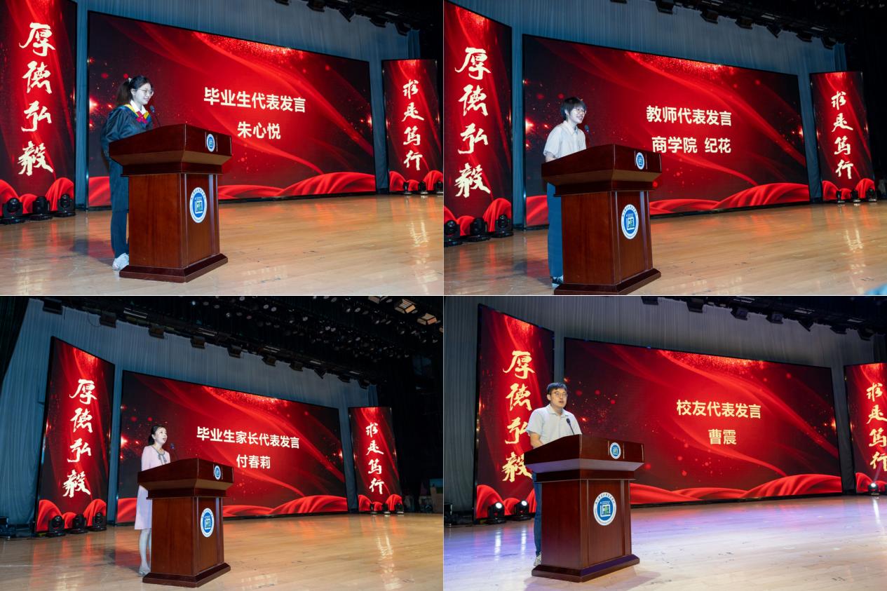 毕业典礼上,教师代表纪花、校友代表曹震、家长代表付春莉勉励同学们带着四年大学积淀的学识和努力拼搏的精神,让青春在日常的三餐烟火,在未来的春夏秋冬,在人生的冷暖悲欢中肆意盛开,绽放光芒。毕业生代表朱心悦同学回顾了四年大学生活,感念师恩,感恩母校,希望与同学们一起继续奋斗,成为母校和家长的骄傲与荣光。