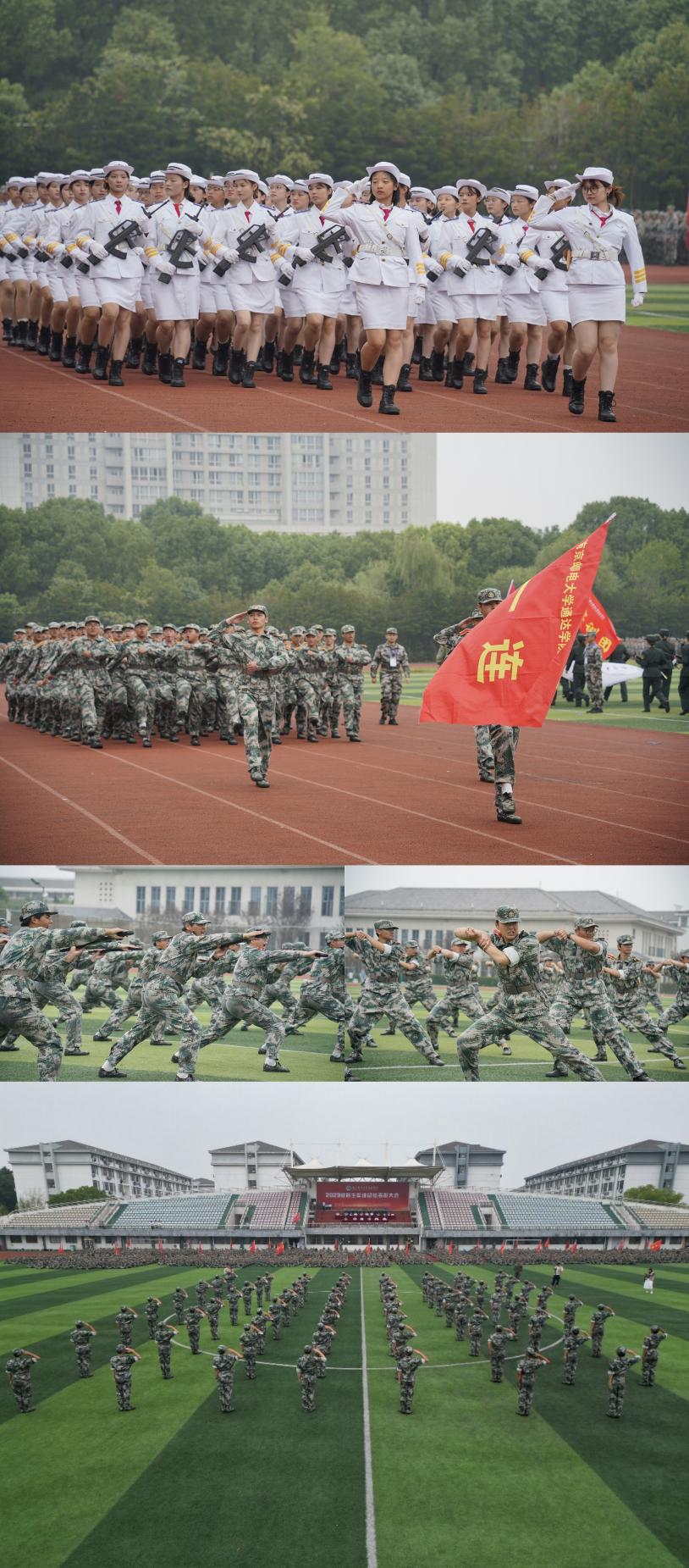 4个营36个军训方队2600余名新生身着迷彩军装,列着整齐的队伍,迈着坚定有力的步伐,依次走过主席台。他们目光如炬、军姿挺拔、气宇轩昂,英姿飒爽,展现了良好的精神风貌和优异的军事训练成果。擒敌拳与刺杀操展示,一令一动,威武雄壮,刚劲有力,尽显通达学子斗志昂扬、勇敢顽强的战斗作风,赢得了在场师生的阵阵掌声。