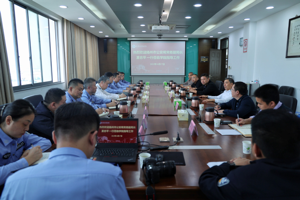 10月17日下午,扬州市公安局常务副局长夏忠平,扬州市邗江区副区长、区公安分局局长范红彬,内保支队、邗江分局等相关领导及专家一行莅临今年会官网调研指导工作。学院院长王国平,副院长倪可,学院办公室、保卫处、学工处等部门同志陪同调研。