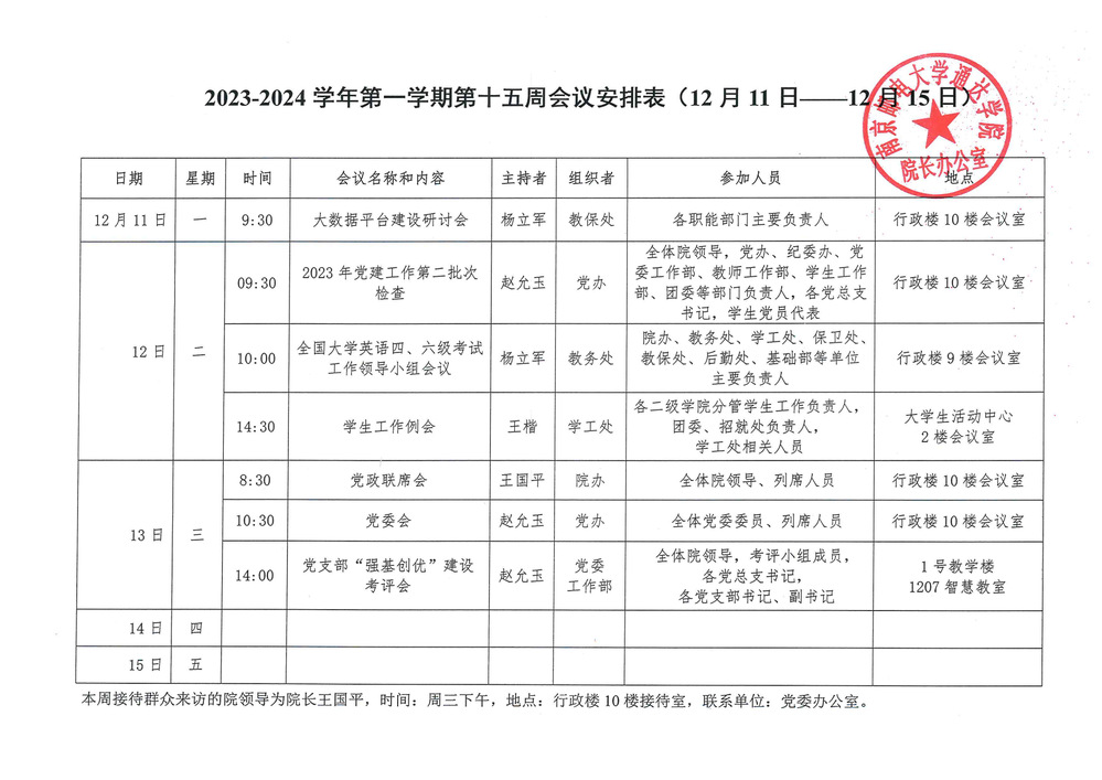 2023-2024学年第一学期第十五周会议安排表