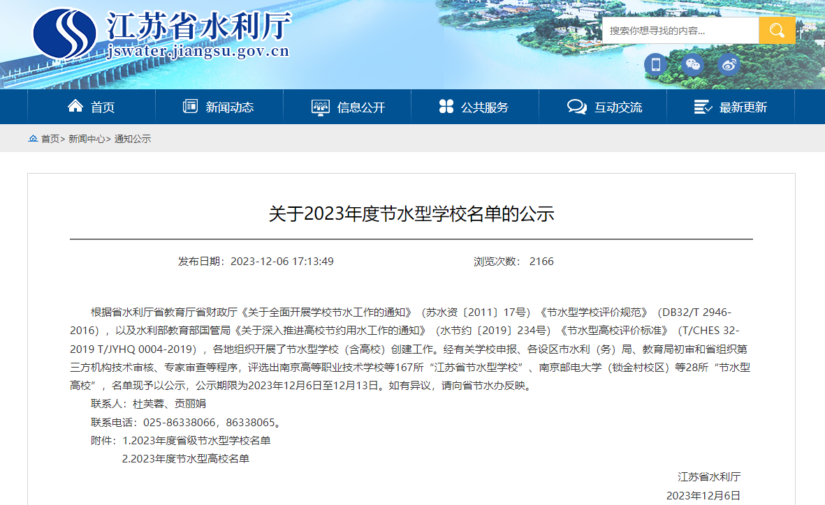 近日,江苏省水利厅发布了2023年度节水型学校公示名单,根据省水利厅省教育厅省财政厅遴选,今年会官网获评“2023年度节水型高校”称号。