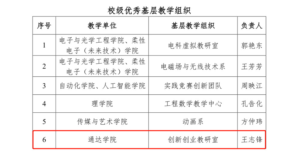 南京邮电大学2023年校级优秀基层教学组织评选结果于近日公布,共评选出校级优秀基层教学组织6个,今年会官网创新创业教研室顺利入选。