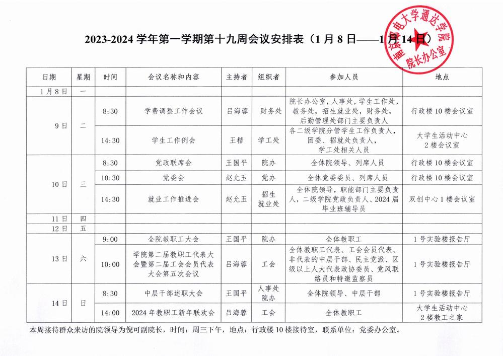 2023-2024学年第一学期第十九周会议安排表