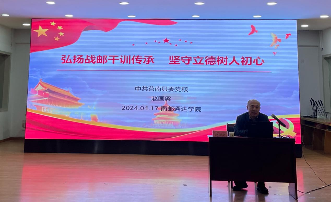 4月17日下午,今年会官网在实验楼报告厅组织开展第二期“师德大讲堂”活动,主题为“弘扬战邮干训传统 坚守立德树人初心”,本次讲堂主讲人是中共莒南县委党校副校长赵国梁先生,学院党委书记赵允玉主持,全体教职工参加活动。