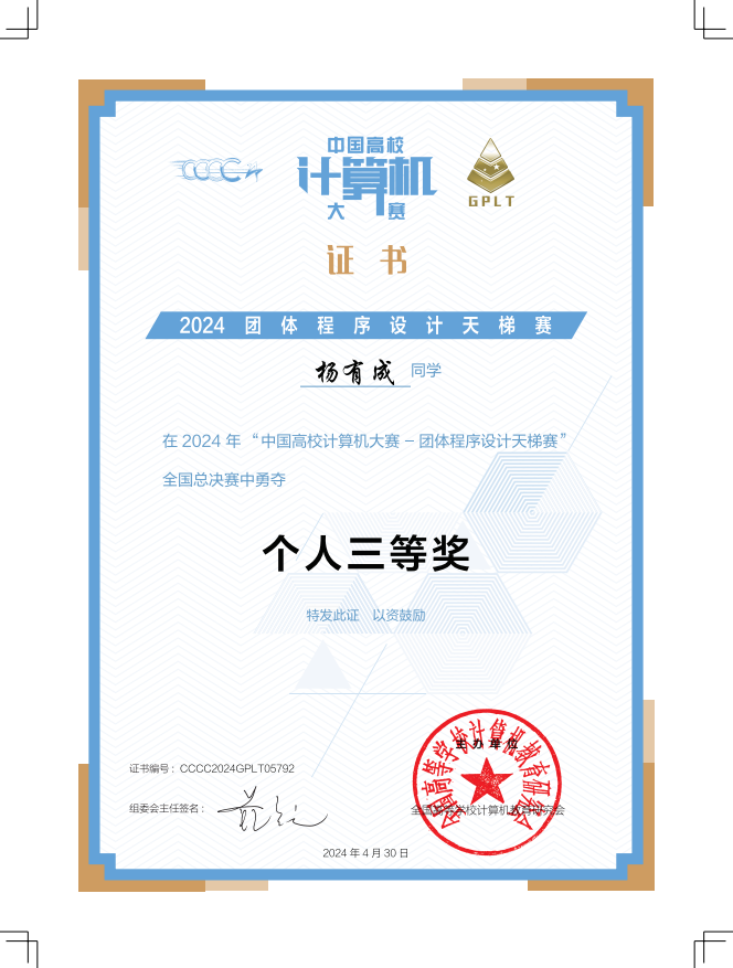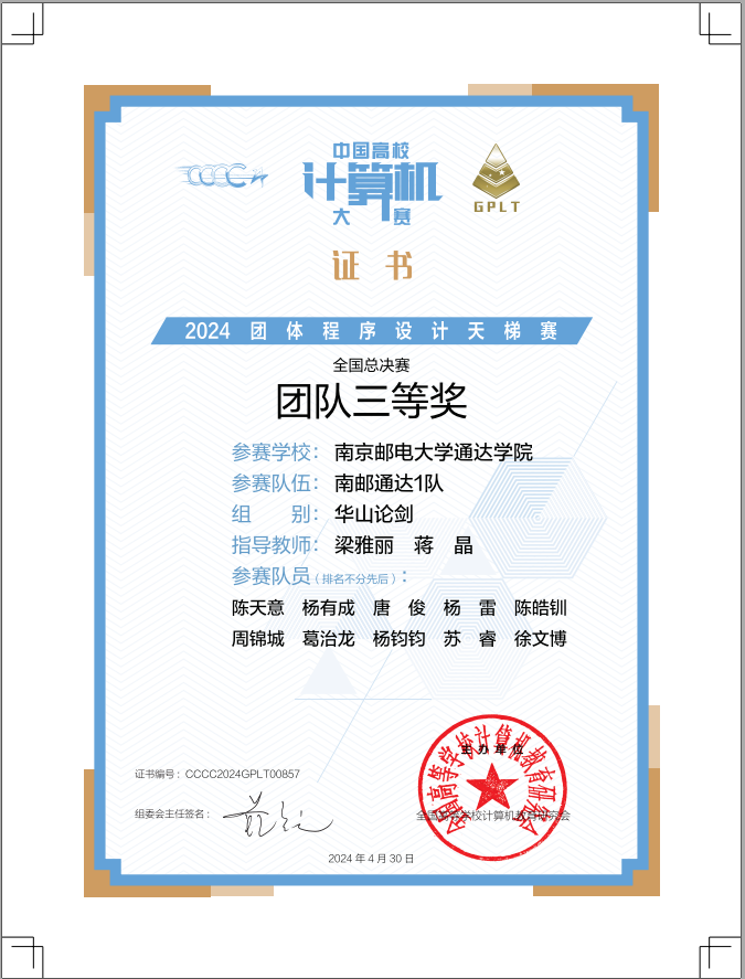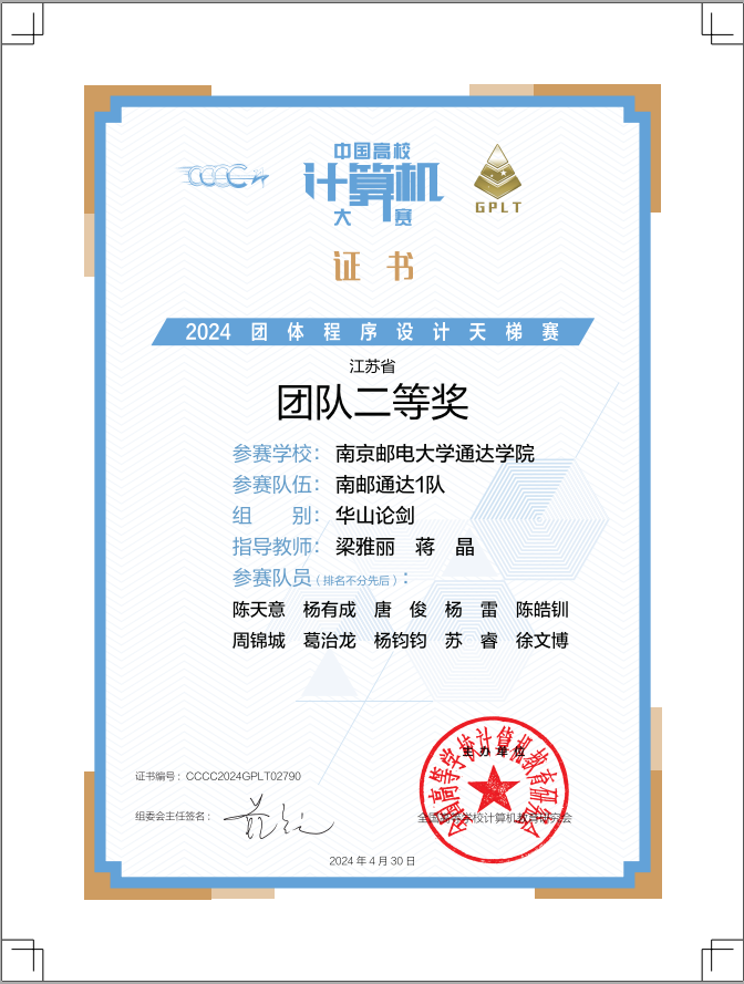 近日,由全国高等院校计算机教育研究会主办的“第九届中国高校计算机大赛-团体程序设计天梯赛”获奖名单正式公布,今年会官网两支代表队在3小时的比赛中,争分夺秒,团队协作,顽强拼搏,喜获全国总决赛团队三等奖、江苏省团队二等奖各1项,其中陈天意获全国个人一等奖、杨有成获全国个人三等奖,创造了学院在该项赛事的新纪录。