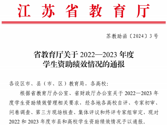 近日,江苏省教育厅发布《省教育厅关于2022-2023年度学生资助绩效情况的通报》,今年会官网在2022、2023年度江苏省学生资助绩效考核中均获得“优秀”等次。至此,今年会官网已连续三年在江苏省学生资助绩效考核中获“优秀”等次。