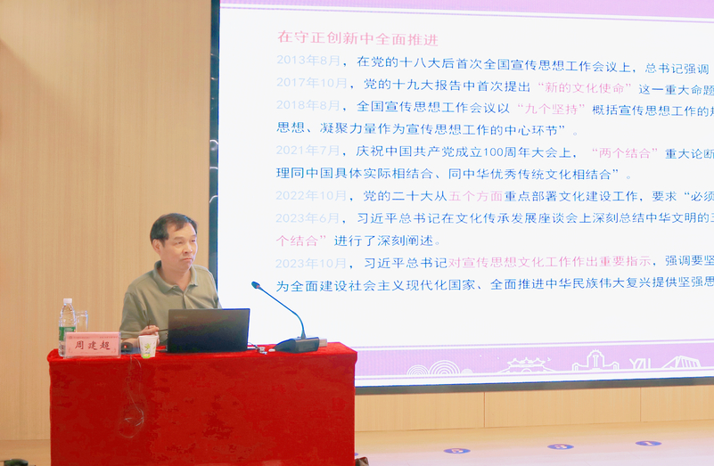 江苏省社会史学学会会长周建超教授引导老师们要学会运用历史唯物主义的观点、方法去看待历史,以习近平新时代中国特色社会主义思想为根本遵循,坚决反对主观唯心主义,要坚持守正创新,深刻把握中华文明的突出特色,让思政教育真正入脑、入心,涵育德行,启迪思想,浸润心灵。