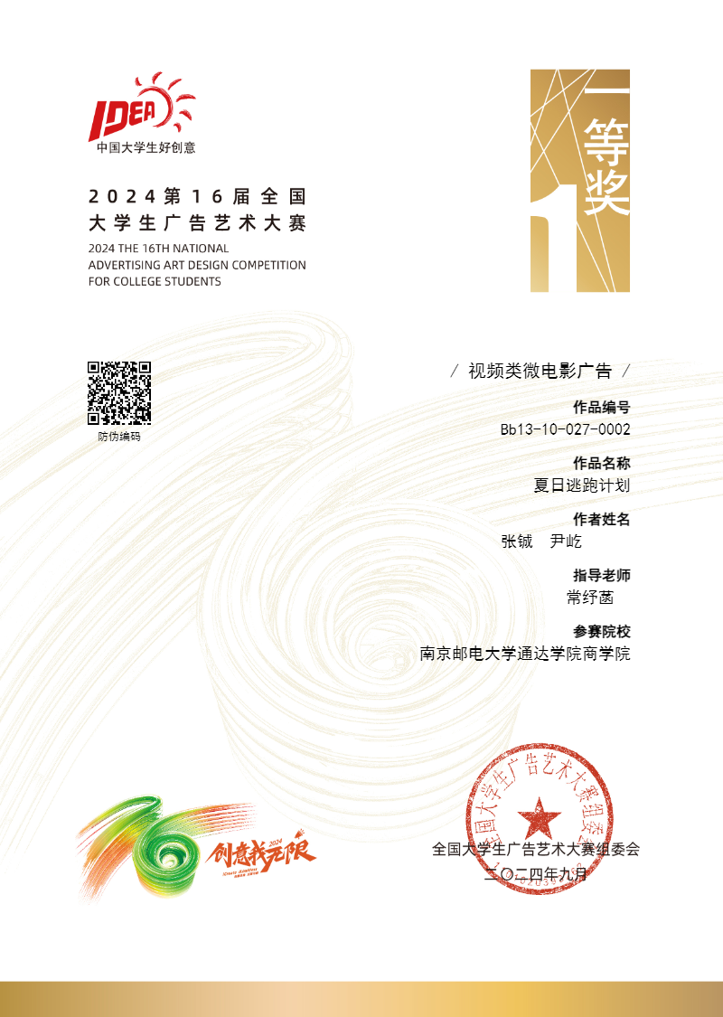 在2024年第16届全国大学生广告艺术大赛全国赛中,商学院指导教师常纾菡、学生张铖(2021级广告学专业)、尹屹(2022级广告学专业)参赛作品《夏日逃跑计划》荣获国赛一等奖。