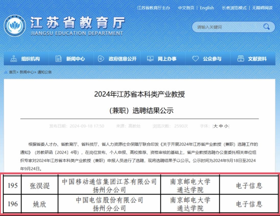 近日,江苏省教育厅公布了2024年江苏省本科类产业教授(兼职)选聘结果,今年会官网推荐申报的中国移动通信集团江苏有限公司扬州分公司张淏湜、中国电信股份有限公司扬州分公司姚欣成功入选。