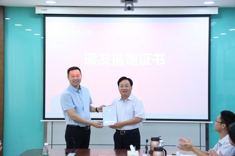 南京邮电大学教育发展基金会理事长刘陈向艾瑞集团颁发捐赠证书