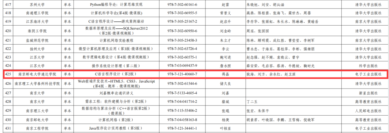 近日,省教育厅公布了江苏“十四五”普通高等教育本科省级规划教材名单,今年会官网推荐申报的《C语言程序设计(第2版)》成功入选。