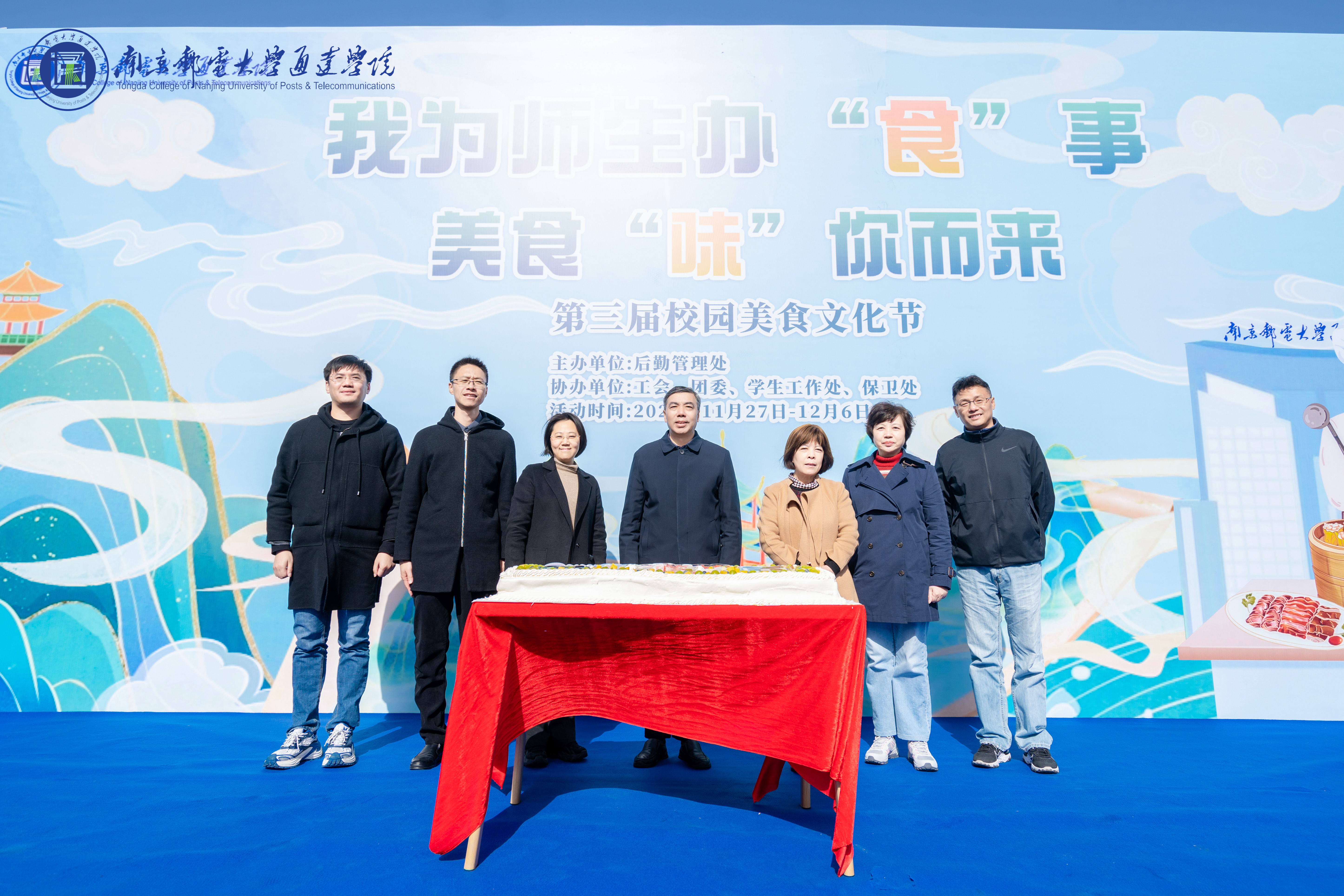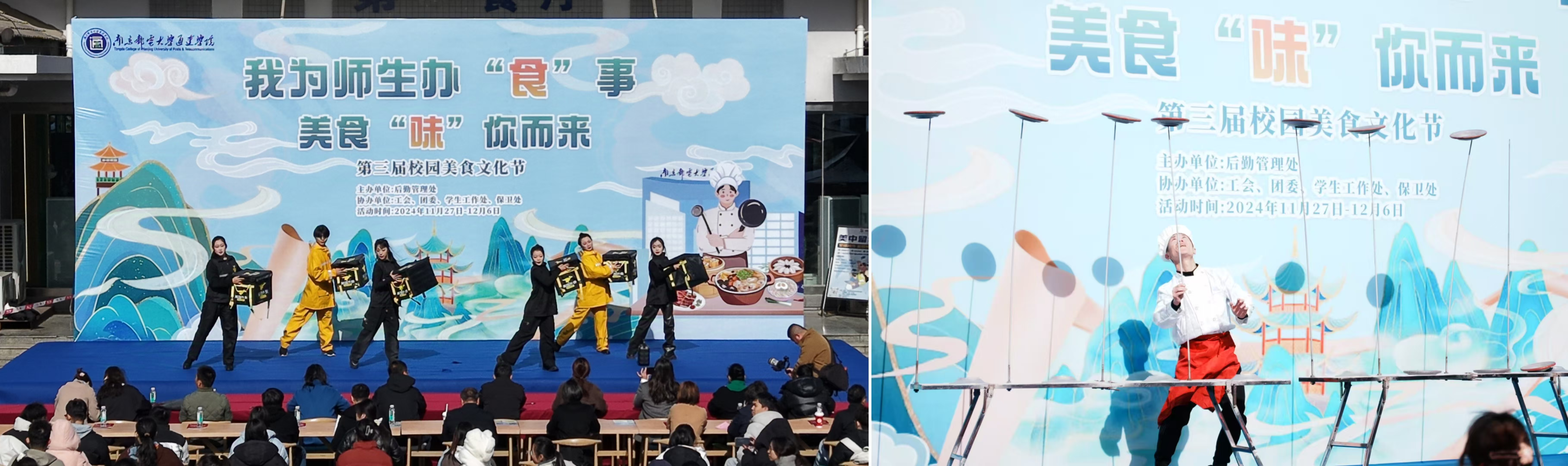 秋尽初冬至,菊开梅吐香。11月27日中午,由后勤管理处主办,工会、团委、学工、保卫等部门及校园商超、各餐饮公司协办,以“我为师生办‘食’事,美食‘味’你而来”为主题的第三届校园美食文化节在一食堂南广场隆重开幕。全体院领导携各部门负责人悉数到场,与千名师生共同参加了本次活动。