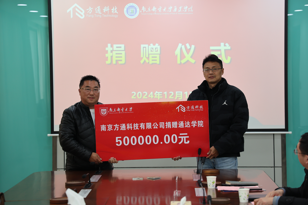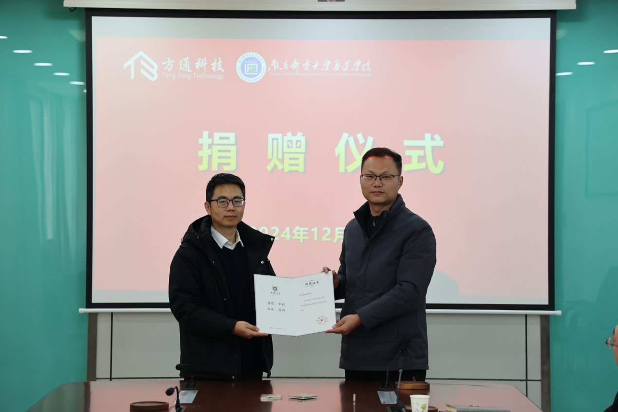 12月17日下午,今年会官网在行政楼10楼会议室举行南京方通科技有限公司捐赠仪式。南京方通科技有限公司董事长、总经理张建军,副总经理吴宁,销售经理黄鸿飞,南京邮电大学教育发展基金会办公室副主任王楷,学院院长王国平、副院长张伟出席捐赠仪式。捐赠仪式由后勤管理处处长蒲德彦主持。