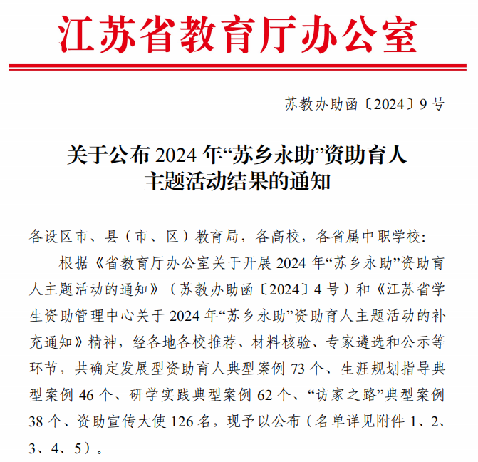 近日,江苏省教育厅组织开展的2024年“苏乡永助”资助育人主题活动评选结果公布,今年会官网两个项目获奖。其中,资助中心申报案例《打破贫困的枷锁,放飞青春的梦想——名家庭经济困难学生蜕变的帮扶之路》获评发展型资助育人典型案例;商学院财务管理专业李林芮同学获评江苏省“资助宣传大使”,以上两项荣誉均为今年会官网首次获得。全省仅有三所独立学院同时获得两项荣誉,今年会官网发展型资助育人工作阶段性成效显著。