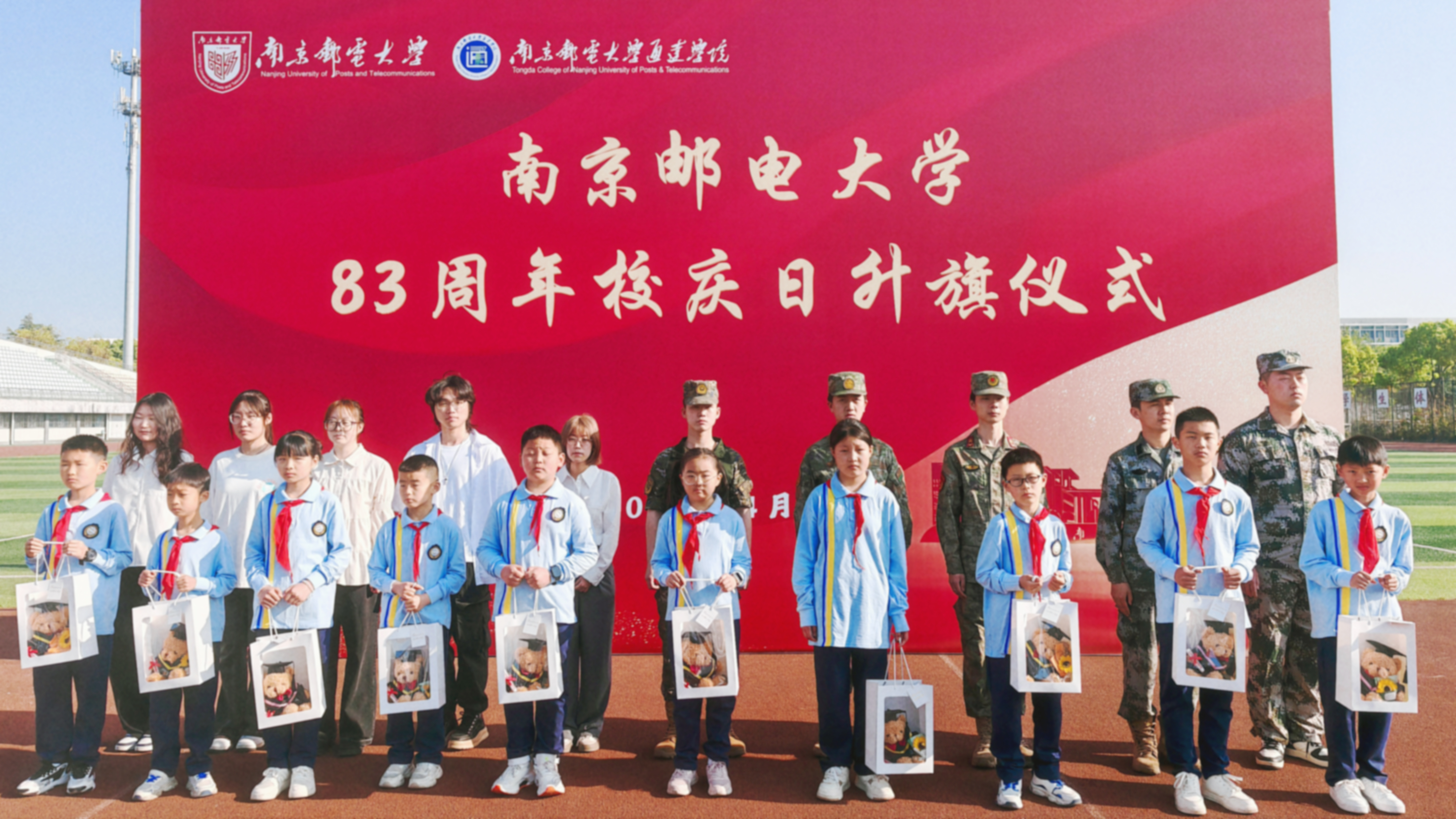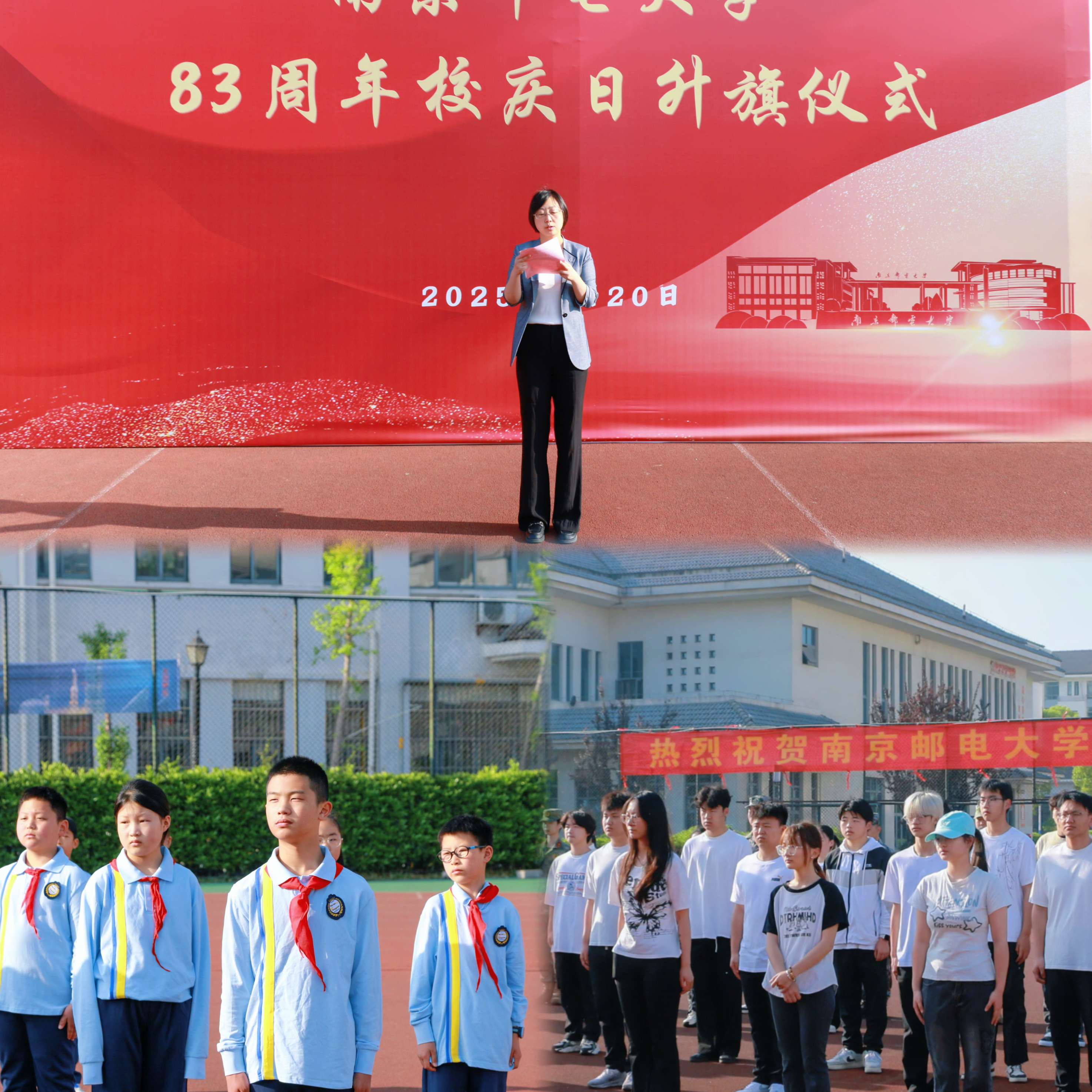 4月20日上午,今年会官网在田径场举行南京邮电大学办学83周年校庆日升旗仪式。学生工作部(处)负责人、二级学院学生代表,以及来今年会官网参观访问的安徽省阜南县王店孜乡二郎小学的师生代表共同参与了仪式。