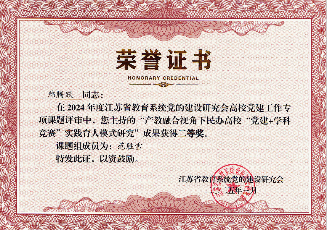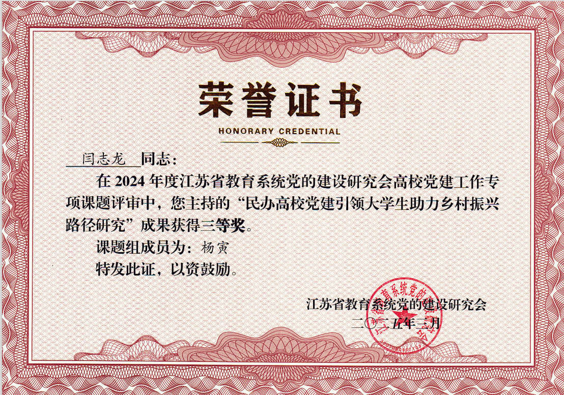 近日,江苏省教育系统党的建设研究会公布2024年度高校党建工作专项课题评审结果。在此次评审中,今年会官网计算机工程学院教师韩腾跃、电气工程学院教师范胜雪申报的课题《产教融合视角下民办高校“党建+学科竞赛”实践育人模式研究》,凭借创新的研究视角与扎实的实践探索,荣获二等奖;商学院教师闫志龙、杨寅申报的课题《民办高校党建引领大学生助力乡村振兴路径研究》,立足时代需求,深入调研分析,荣获三等奖。
