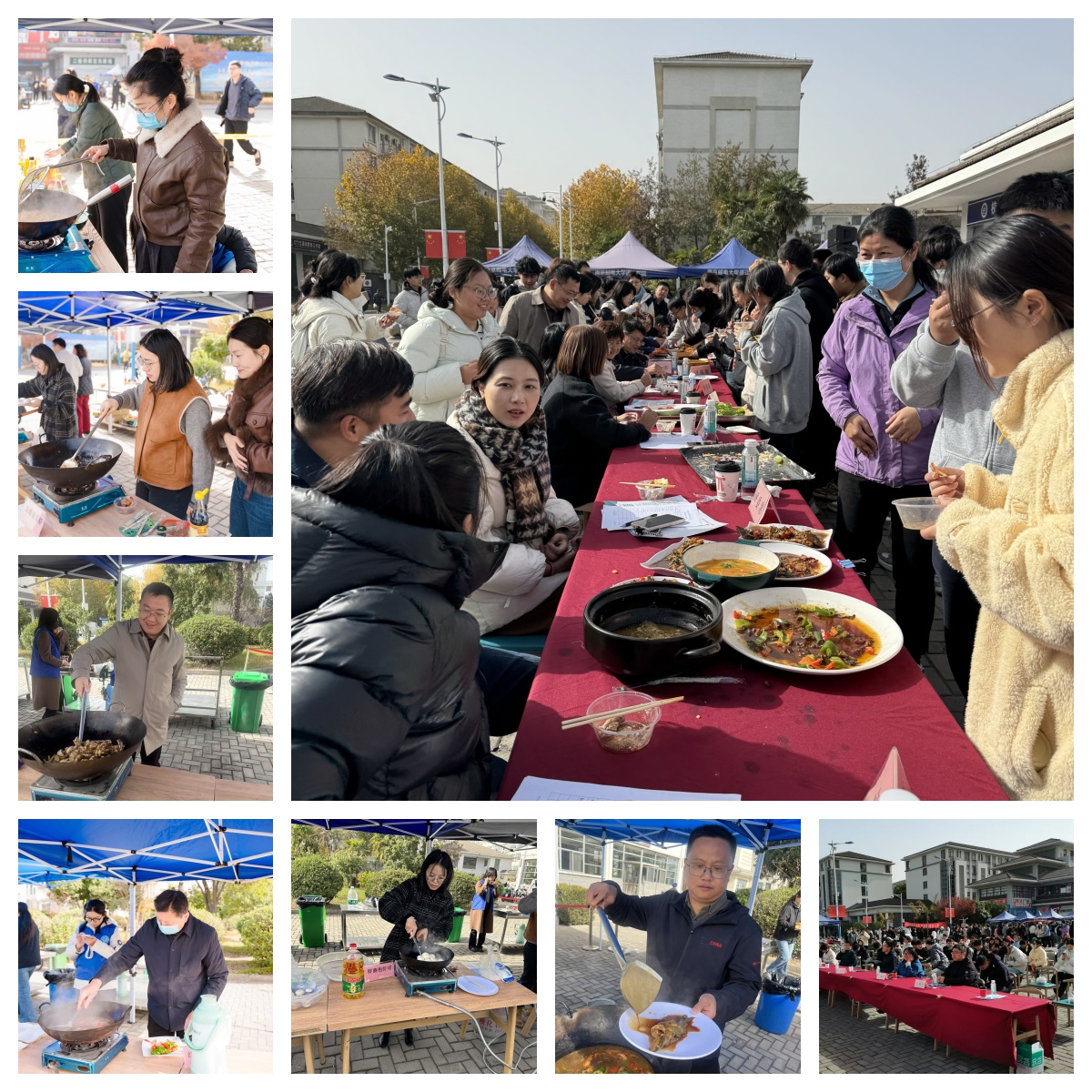 老师们在厨艺大赛中煎炒蒸炸、各显神通。“从从容容、邮人有鱼”“金汤酸辣肥牛”“清心菌香聚珍煲”等一盘盘珍馐美馔,挑动着所有现场师生的味蕾。操场上,一场舌尖上的校园盛宴火热上演。