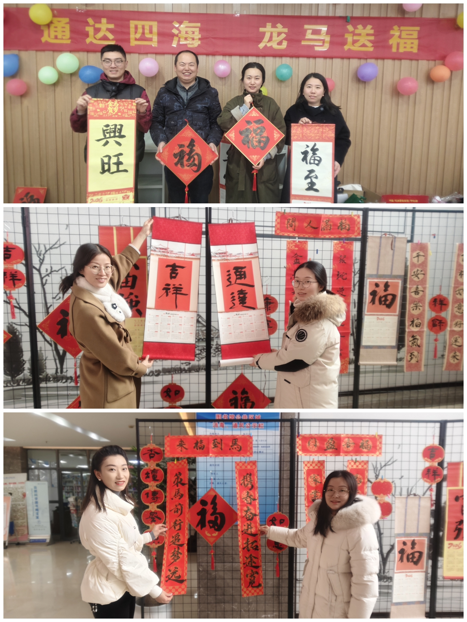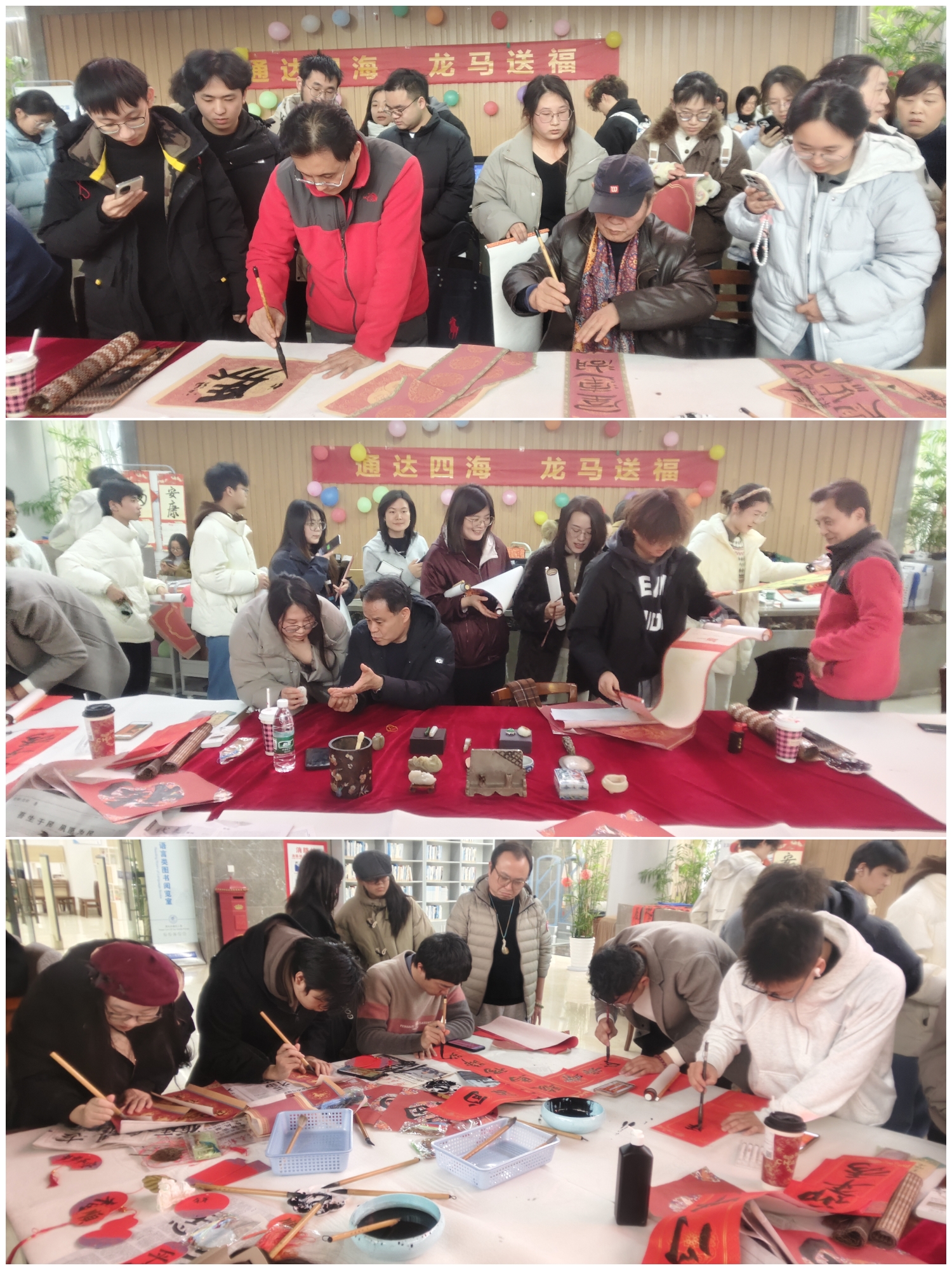 活动现场墨香四溢、暖意融融。受邀而来的文艺家们凝神挥毫,笔走龙蛇间,将“龙马精神”的昂扬斗志、“福满校园”的美好期许凝于笔端;师生代表们踊跃参与,或虚心向文艺家请教笔法,或独立创作抒发心意,一副副对仗工整、寓意吉祥的春联,一个个遒劲有力、饱含温情的“福”字跃然纸上,让整个图书馆充满了欢乐喜庆的节日气息。