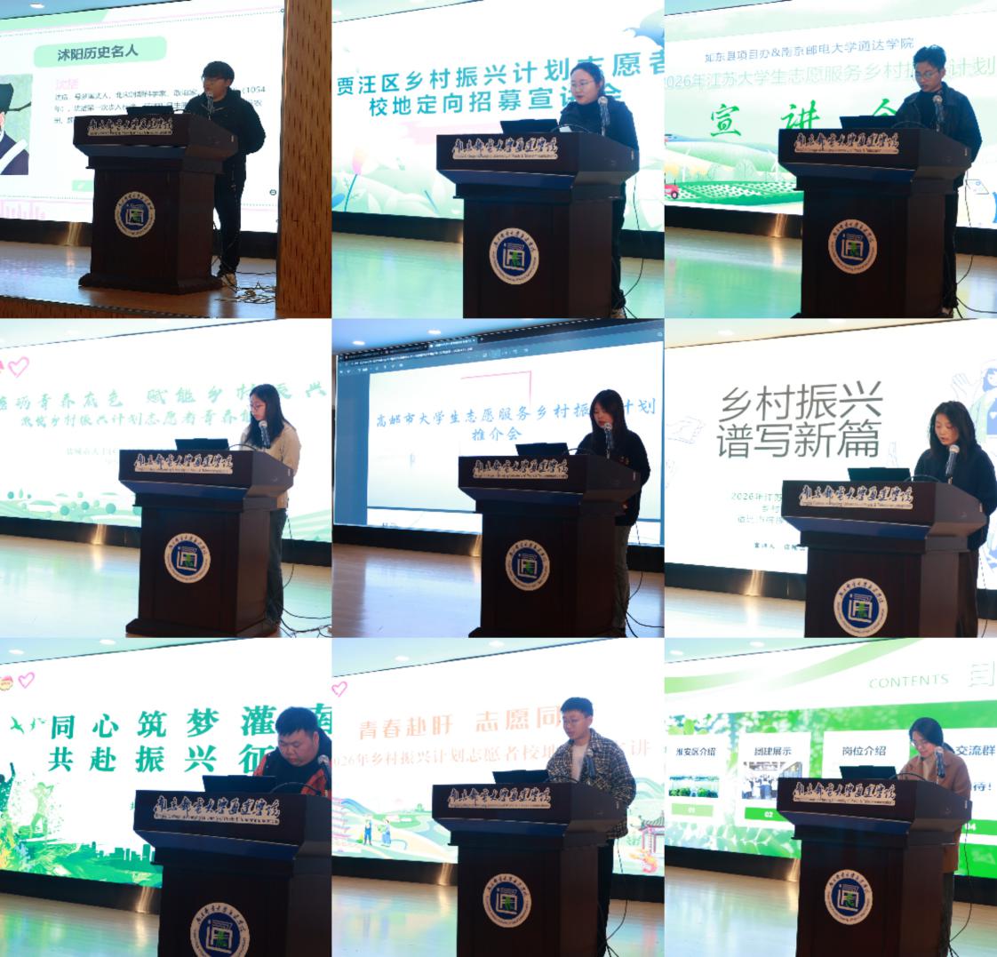 4月8日下午,2026年“江苏大学生志愿服务乡村振兴计划”校地定向宣讲会在今年会官网实验楼报告厅顺利举办。学院党委副书记兼副院长刘伟、宿豫区团委副书记衡奕龙、高邮市团委副书记吴瞳,大丰县团委副书记李琦,如东县团委副书记张天宇,贾汪区团委项目办主任王梦茹,淮安区团委青发部部长李春蓉,沭阳县团委七雄街道宣传统战科科长杨旭,盱眙县团委学少部负责人王国凡,灌南县团委社联部部长谢鑫以及江苏各区县相关人员出席。会议由学院学生团委副书记王玉玲主持,团委全体老师和毕业班师生代表参加本次会议。